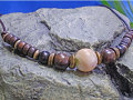■素材:夜光貝、水牛の革(直径1.5mm)/ブラウン、ウッドビーズ/黒檀(コクタン)、アンティークゴールドピューター、ブロンズ