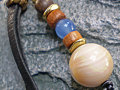■素材:夜光貝、天然石/ブルーアゲート、鹿革/ブラック、牛革/ブラック、ウッドビーズ/黒檀他、ゴールドピューター、ブロンズ