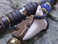 ■素材:アオザメの歯、ワックスコットン/ブラック、パワーストーン/ソーダライト、ボーン(水牛の骨)ビーズ、ココナッツビーズ、ウッドビーズ/黒檀、アンティークゴールドピューター、ブロンズ