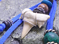 ■素材:サメ歯化石、スエードコード/ブルー、クレイビーズ、ボーン&ホーン(水牛の骨&角)ビーズ、ウッドビーズ/黒檀(コクタン)、キャストピューター、メタルビーズ