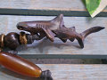■素材:木彫りのシュモクザメ(ハンマーヘッドシャーク)/黒檀(コクタン)、ワックスコットン/ブラック、ボーン&ホーン(水牛の骨&角)ビーズ、ウッドビーズ/黒檀、アンティークゴールドピューター、キーホルダー金具/ブロンズ