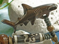 ■素材:木彫りのシュモクザメ/黒檀、ワックスコットン/ブラック、ボーン(水牛の骨)ビーズ、ウッドビーズ/白檀他、アンティークゴールドピューター、ブロンズ、キーホルダー金具/ブロンズ