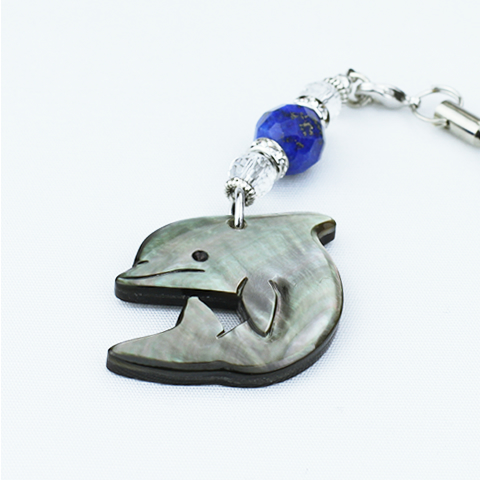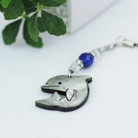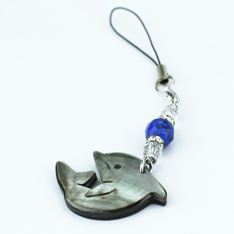この黒蝶貝の「イルカ」のパーツと天然石の「ラピスラズリ」「水晶」を組み合わせて、 当店で心を込めて手作りしたストラップです。