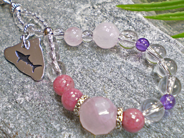 ■素材:サメ/スターリングシルバー(ロジウムコーティング)、天然石/ローズクォーツ丸玉カット(直径約10mm)・ローズクォーツ(直径約8mm×1、約6mm×1)・ロードナイト(直径約6mm×3)・アメジスト(直径約4mm×2)・水晶(直径約6mm×6、約4mm×5、約3mm×12)、メタルビーズ