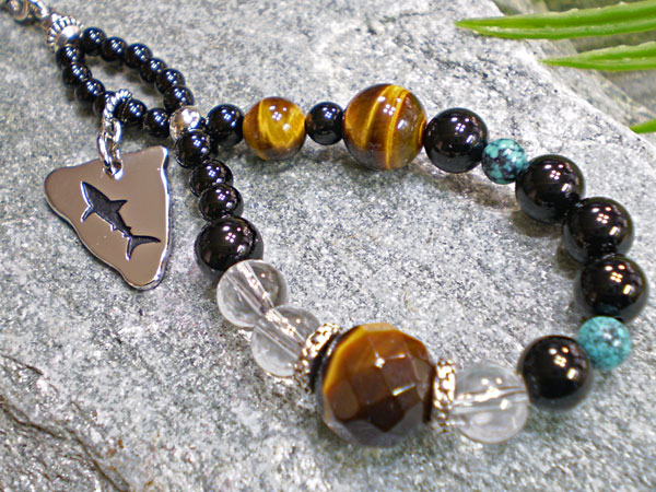■素材:サメ/スターリングシルバー(ロジウムコーティング)、天然石/タイガーアイ丸玉カット(直径約10mm)・タイガーアイ(直径約8mm×1、約6mm×1)・水晶(直径約6mm×3)・ターコイズ(直径約4mm×2)・オニキス(直径約6mm×6、約4mm×5、約3mm×12)、メタルビーズ