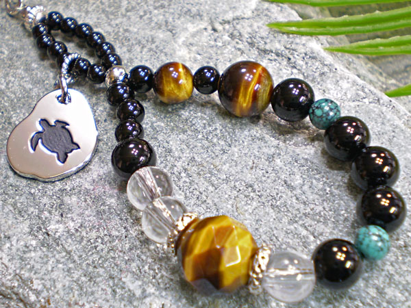 ■素材:カメ/スターリングシルバー(ロジウムコーティング)、天然石/タイガーアイ丸玉カット(直径約10mm)・タイガーアイ(直径約8mm×1、約6mm×1)・水晶(直径約6mm×3)・ターコイズ(直径約4mm×2)・オニキス(直径約6mm×6、約4mm×5、約3mm×12)、メタルビーズ